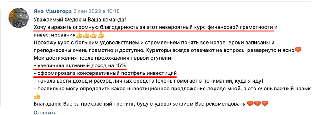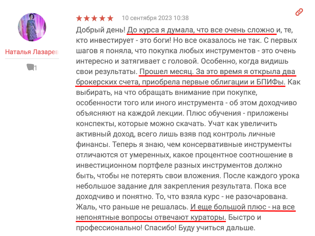 Мы начнем с простой практики работы с инвестиционными инструментами и первых вложений от 1000 рублей в наиболее надежные и безопасные инструменты - облигации и фонды, а далее будем пошагово совершенствовать свои навыки при работе с акциями крупнейших российских компаний и максимально безопасно строить свой капитал.